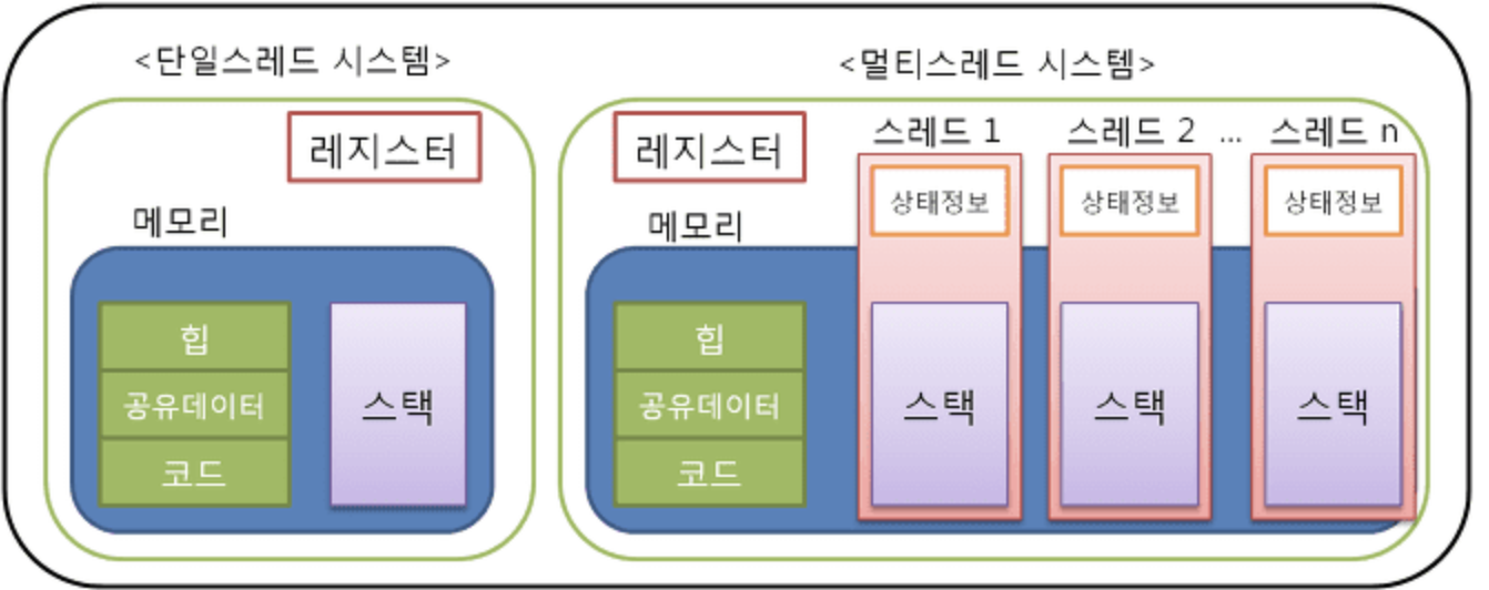 - 프로세스로부터 스택 영역을 각 스레드는 할당 받고 힙과 데이터 영역을 스레드끼리 공유함