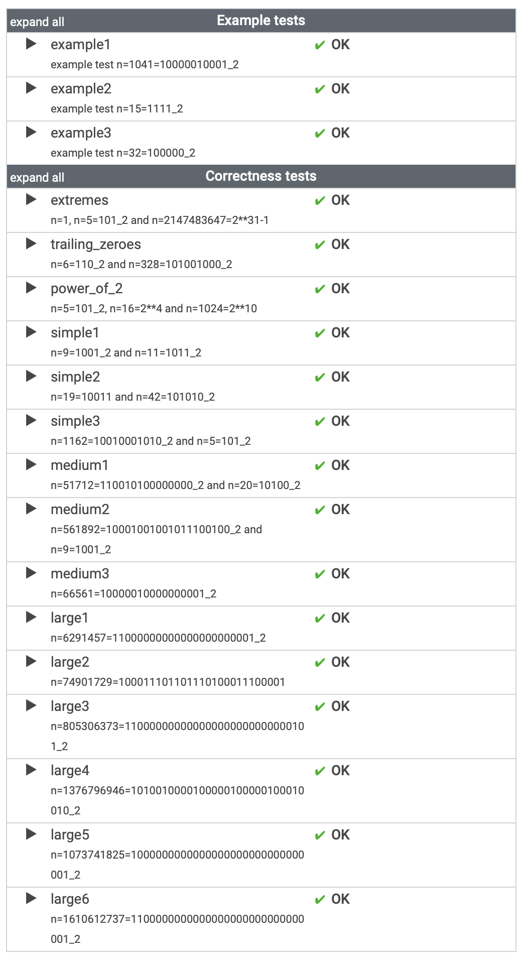 For example, number 9 has binary representation 1001 and contains a binary gap of length 2. The number 529 has binary representation 1000010001 and contains two binary gaps: one of length 4 and one of length 3. The number 20 has binary representation 10100 and contains one binary gap of length 1. The number 15 has binary representation 1111 and has no binary gaps. The number 32 has binary representation 100000 and has no binary gaps.