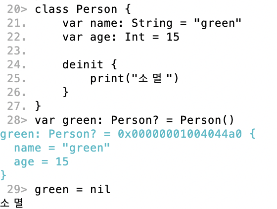 인스턴스 생성 및 소멸 -. 위 코드에서 Person 클래스의 green 인스턴스 생성 시 Person 뒤 물음표(?)를 붙여주었습니다.