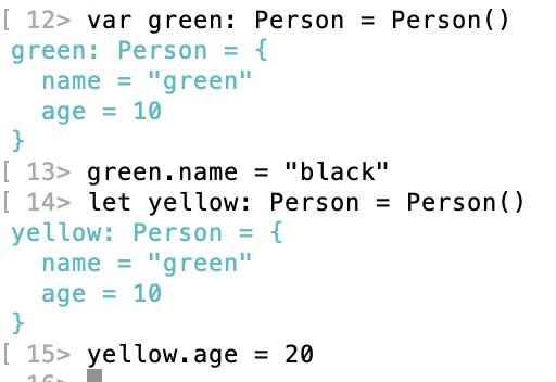 var green:Person = Person() let blakc: Person = green let yellow: Person = Person() print(green === black) //true print(green === yellow) //false print(blakc !== yellow) //true구조체에서 기존 인스턴스를 따라 생성하면 해당 인스턴스의 값을 변경하더라도 값만 복사하여 변경한것으로 기존 인스턴스의 값은 변경되지 않습니다.