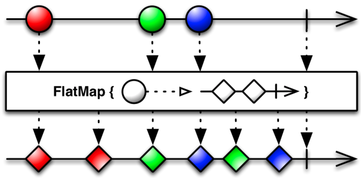 let observableOfInt = Observable.of(1, 2, 3) let observableOfString = Observable.of("GREEN", "RED") observableOfInt .flatMap { (num) -> Observable<String> in print("Emit: \(num)") return observableOfString } .subscribeNext { print("Emit: \($0)") } // Emit: 1 // Emit: GREEN // Emint: RED // Emit: 2 // Emit: GREEN // Emint: RED // Emit: 3 // Emit: GREEN // Emint: RED1, 2, 3 Int를 가진 옵저버블과 GREEN, RED String을 가진 두 옵저버블이 있습니다.