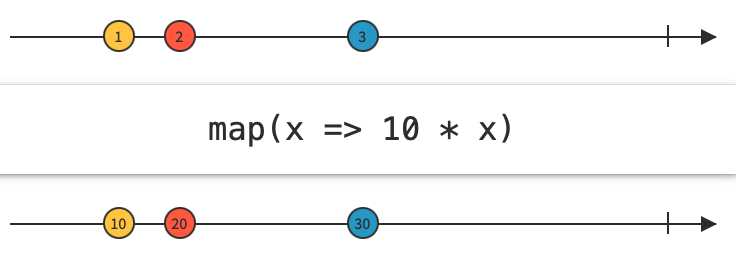 let disposeBag = DisposeBag() Observable.of(1, 2, 3, 4, 5, 6) .map{ $0 * 10 } .subscribe(onNext: { print($0) }) .disposed(by: disposeBag) // 10 // 20 // 30 // 40 // 50 // 60이렇게 10씩 곱해주는 map 오퍼레이터를 통해 값을 방출합니다.