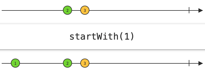 let input = Observable.of(2, 3, 4) let observable = input.startWith(1) observable.subscribe(onNext: { print("value is \($0)") }) // value is 1 // value is 2 // value is 3 // value is 4이렇게 2~4까지 생성된 옵저버블에 초기값을 1로 주어 방출 할 수 있습니다.
