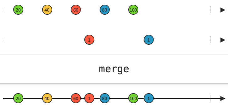 let firstInput = Observable.of("Green", "Red") let secondInput = Observable.of("Blue", "White") let observable = Observable.concat([ firstInput, secondInput, ]) observable.subscribe(onNext: { print("value is \($0)") }) // value is Green // value is Red // value is Blue // value is White요 어레이에 들어가는 순서대로 담겨진다고 생각하면 됩니다.