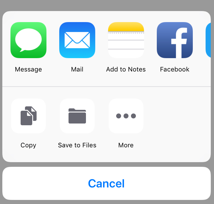 guard let image = UIImage(named: "Green.png") else { return } let shareItems = [image] let activityController = UIActivityViewController( activityItems: shareItems, applicationActivities: nil ) self.present(activityController, animated: true, completion: nil)3. URL