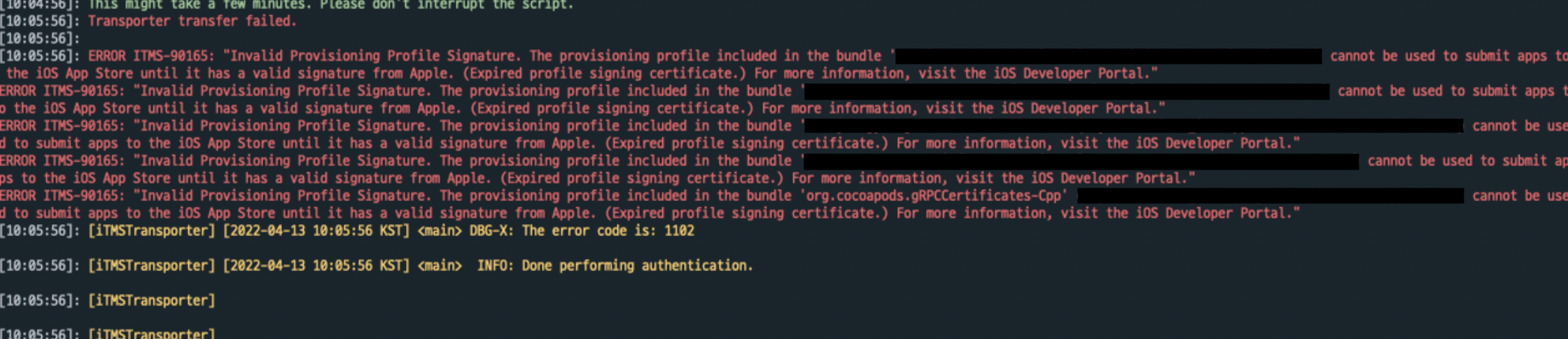갑자기 오늘 빌드를 올리기 위해 fastlane으로 앱 커넥트 사이트에 업로드 하는 도중 아래와 같은 문제를 만났어요😭