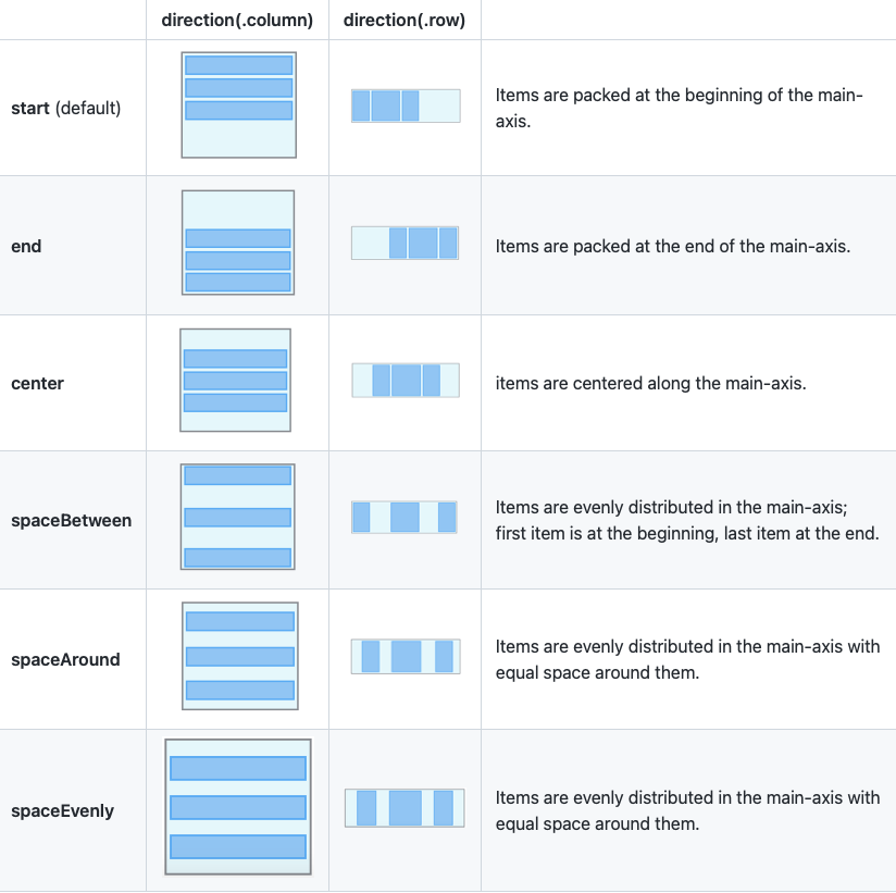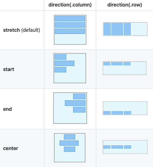 박스안에 요소들이 위치할때 Stack에 가득찰지 시작점에서 해당 콘텐츠 크기만큼 찰지 등 어떻게 정렬을 시켜줄지에 대한 방식입니다.