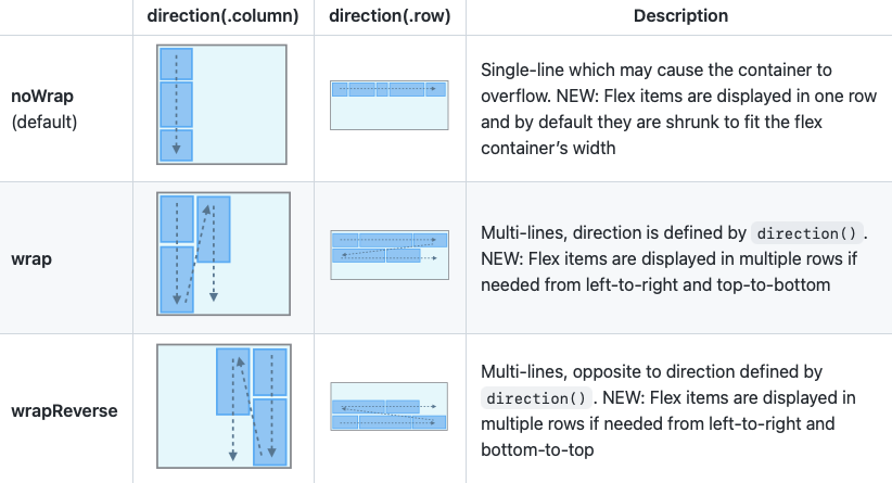 view.flex.wrap(.nowrap) // Default view.flex.wrap(.wrap) view.flex.wrap(.wrapReverse)alignContent()