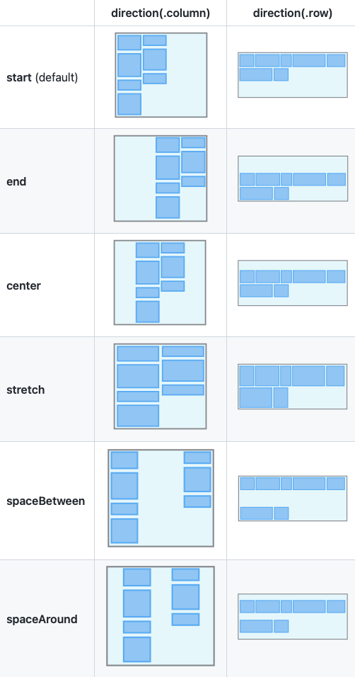 view.flex.alignContent(.start) // Default view.flex.alignContent(.end) view.flex.alignContent(.center) view.flex.alignContent(.spaceBetween) view.flex.alignContent(.spaceArround) view.flex.alignContent(.spaceEvenly)layoutDirection()