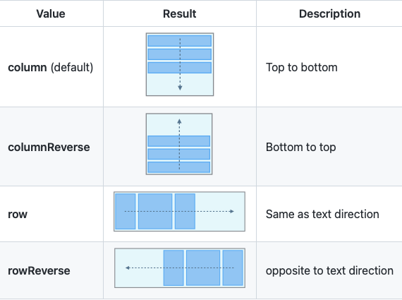 column(행, 위->아래). columnReverse(행, 아래->위), row(열, 좌->우), rowReverse(열, 우->좌)