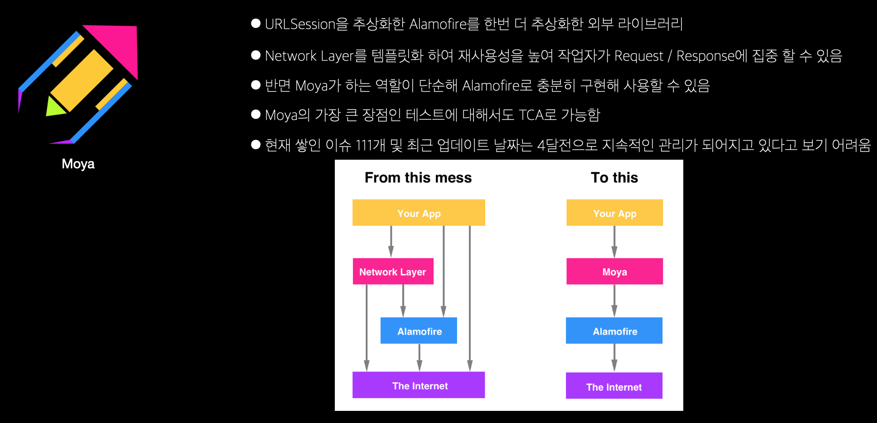 저는 그렇기에 택한다면 Alamofire로 서버 통신을 해주며 네트워크 레이어를 도메인에 맞게 커스텀하게 추상화해 사용하는쪽이 더 좋을거라 생각합니다.