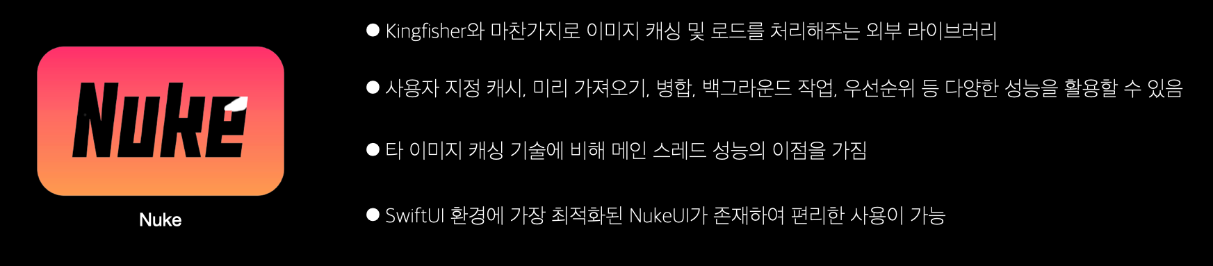 특히 NukeUI가 존재하는데 SwiftUI 환경에 가장 최적화 되어 있다고 생각해요.