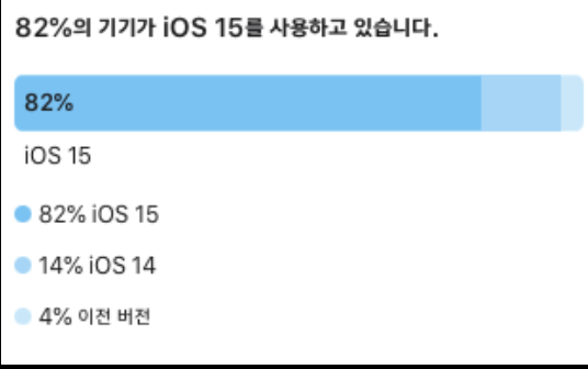 보시는것과 같이 현재 82%의 기기가 iOS 15 이상을 사용하고 있고 14 이상까지 합치면 96%로 iOS 13을 더이상 회사 서비스 측면이 아니라면 가져갈 이유가 크게 없다고 생각합니다.
