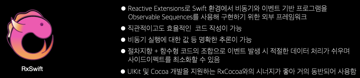 마찬가지로 비동기 처리에서는 RxSwift와 쌍벽을 이루고 이루고 있습니다.