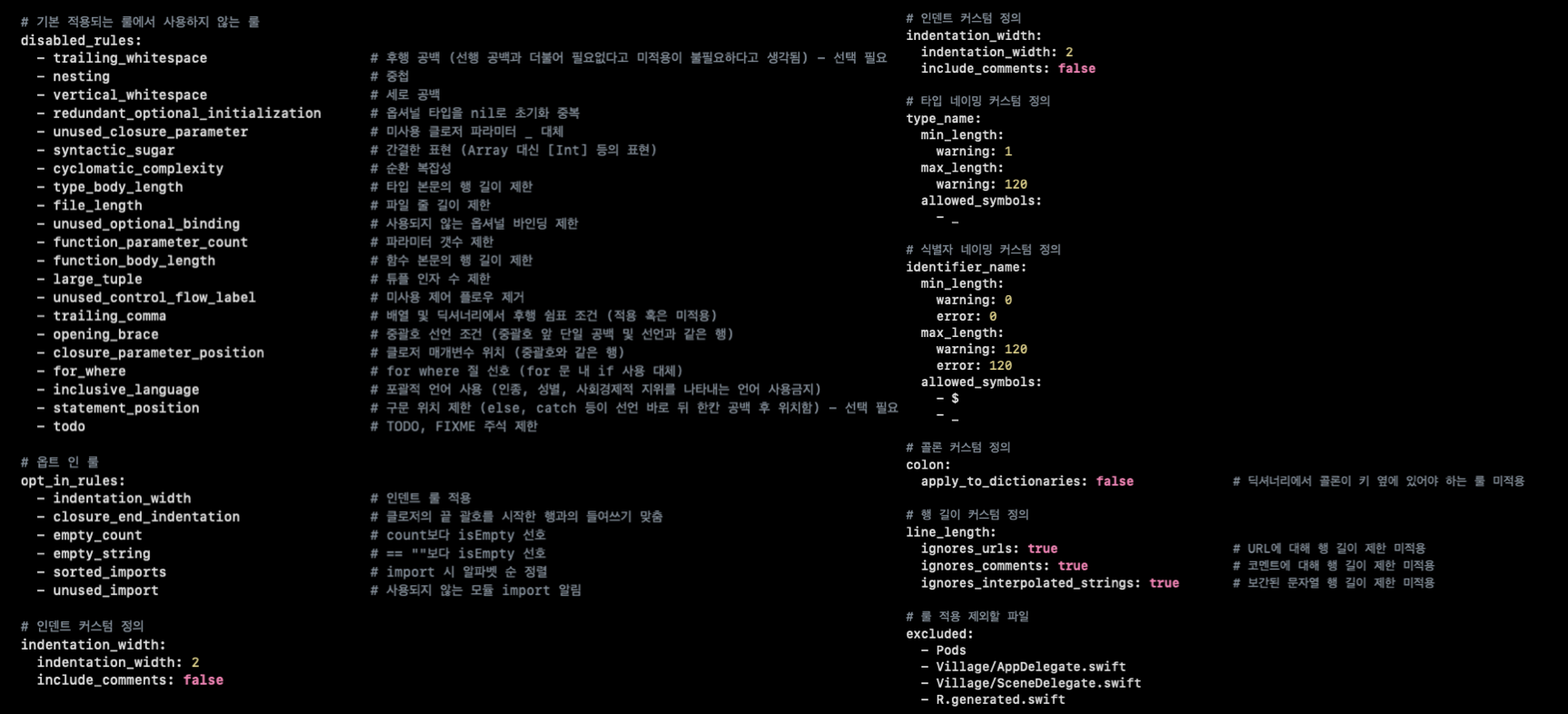 SwiftFormat도 있지만 저는 SwiftLint가 많은 옵트인 룰을 가지고 있다고 생각하고 커스텀하기에 최적이라고 생각이 듭니다.
