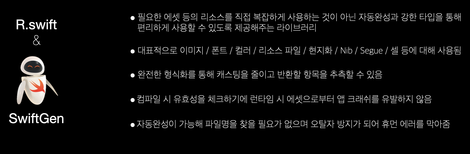 R.swift를 통해 에셋 리소스를 generate 해주는 과정들을 SwiftGen에서 stencil이라는 스위프트를 위한 템플릿 언어를 사용해 템플릿화 시켜 구동시켜주면 R.swift를 걷어내도 무방합니다.