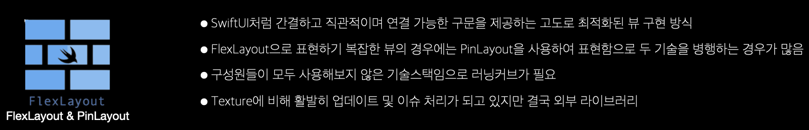 텍스쳐와 마찬가지로 외부 라이브러리이고 개인적으로 SwiftUI 처럼 쉽고 간결하고 직관적이여서 좋은 사용 경험이 있습니다.