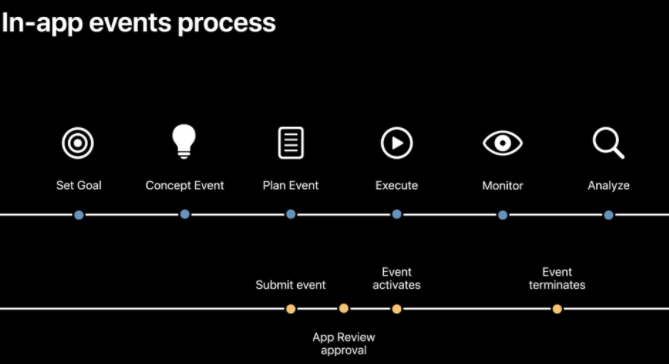 종합적으로 인 앱 이벤트에 대해 구상하고 설정하여 심사받고 분석하기까지의 프로세스는 아래와 같습니다.