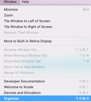 Xcode에서 Window > Organizer를 들어가줍니다.