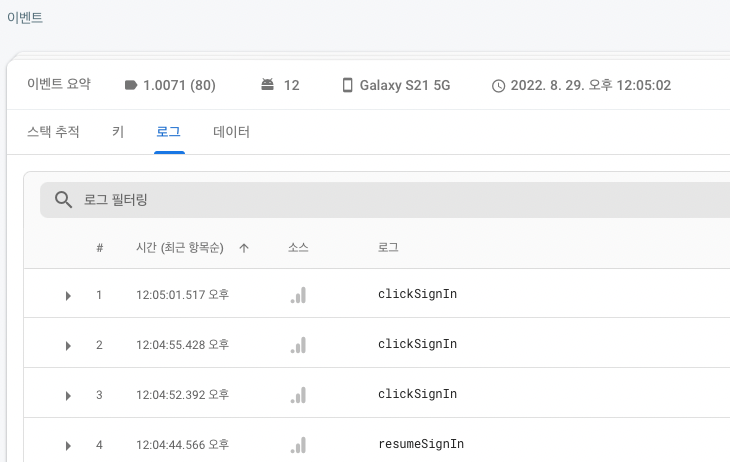 이렇게 스택 추적 / 키 / 로그 / 데이터를 탭 별로 확인할 수 있습니다.