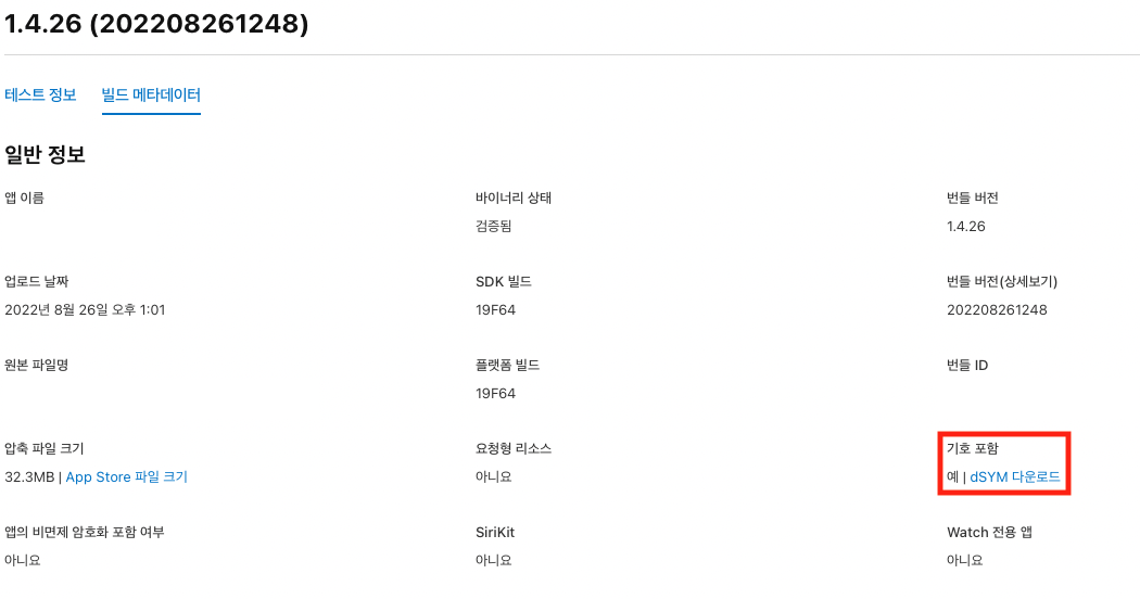 그럼 여기서 빌드 메타 데이터 탭에서 기호 포함 요 부분이 dSYM 정보를 가지고 있는 항목입니다.