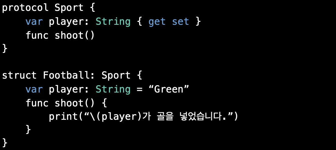 우선 프로토콜은 아래와 같이 틀을 만들고 구조체를 통해 그 틀의 정해진 요구사항을 구현한다.