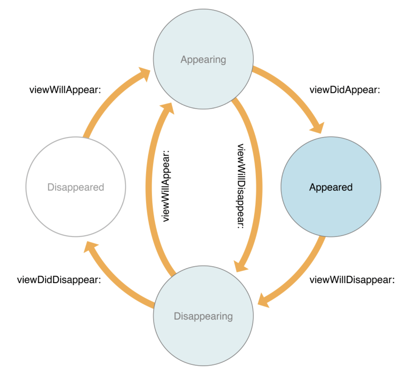 뷰가 화면에 나타나고 사라질때 그 순환 싸이클을 나타내는것으로 뷰 컨트롤러에는 아래와 같이 여러 단계의 생명주기를 가지고 있습니다.
