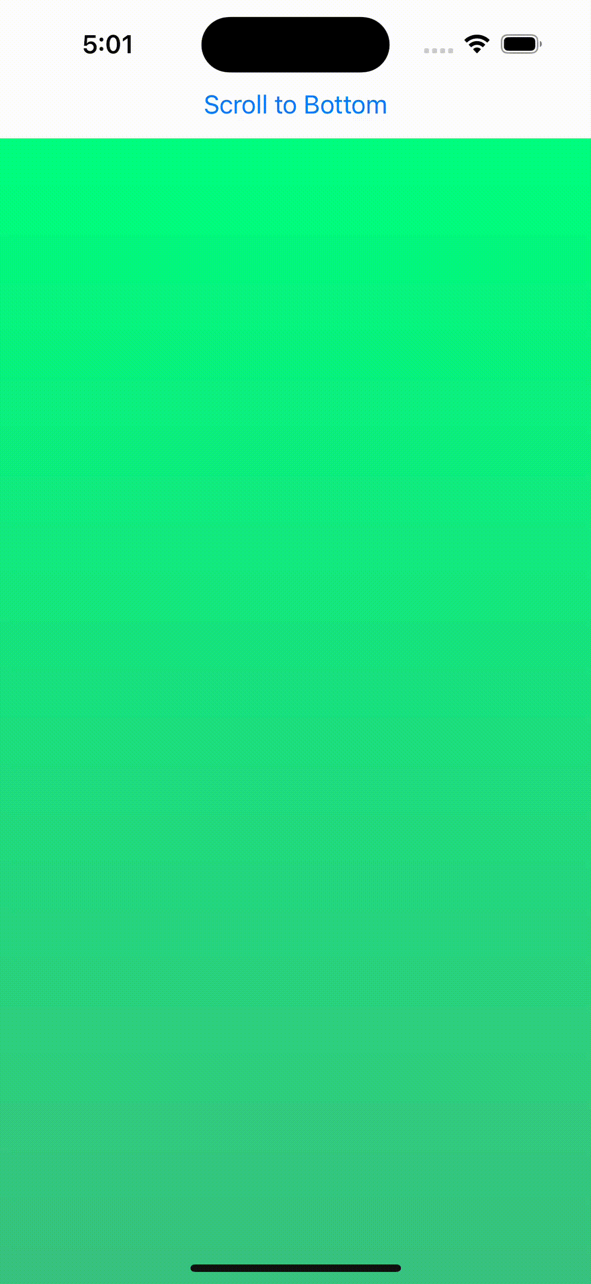 @Namespace var topID @Namespace var bottomID var body: some View { ScrollViewReader { proxy in ScrollView { Button("Scroll to Bottom") { withAnimation { proxy.scrollTo(bottomID) } } .id(topID) VStack(spacing: 0) { ForEach(0..<100) { i in color(fraction: Double(i) / 100) .frame(height: 32) } } Button("Top") { withAnimation { proxy.scrollTo(topID) } } .id(bottomID) } } } func color(fraction: Double) -> Color { Color(red: fraction, green: 1 - fraction, blue: 0.5) }ScrollViewReader의 Content View Builder ScrollViewProxy라는 프록시 인스턴스를 받습니다.