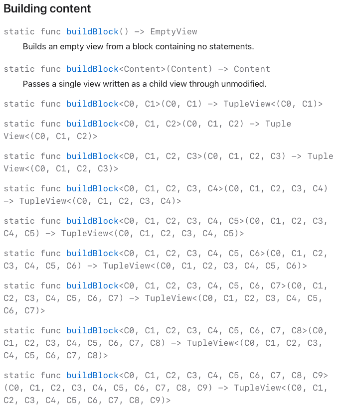 struct MyView: View { var body: some View { Text("Hello, World!") Text("Green") Button( action: { }, label: { Text("Button") } ) Image(systemName: "close") } }공식문서에서 buildBlock을 보면 다양하게 존재합니다.
