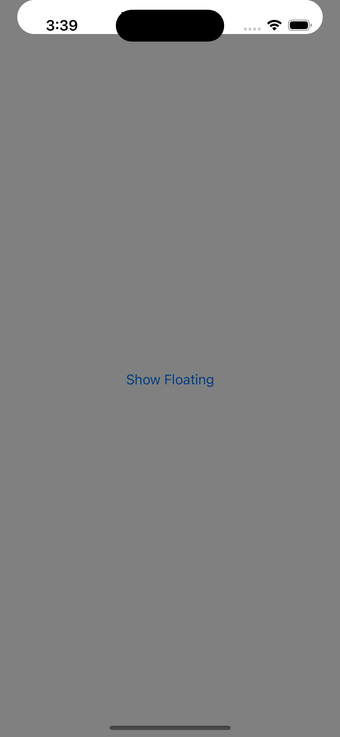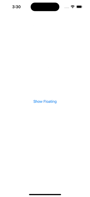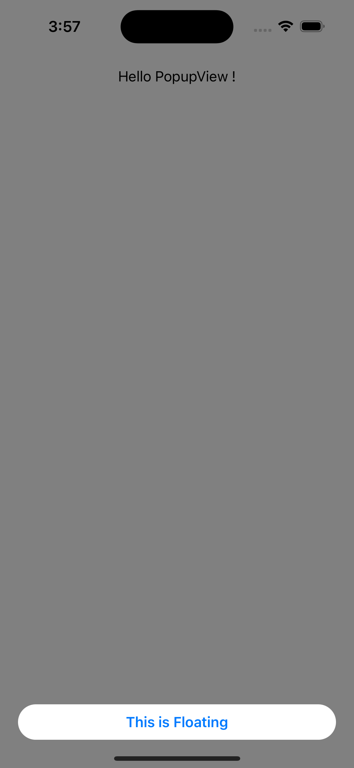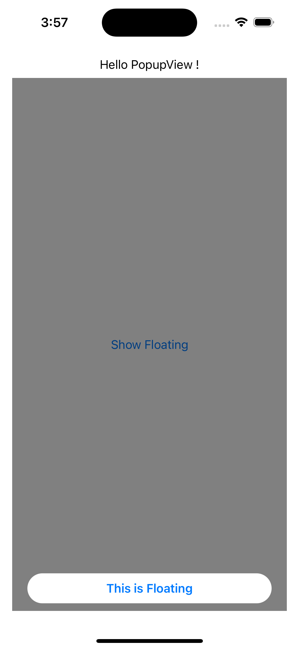 import SwiftUI import PopupView struct ContentView: View { @State var isPresentedFloating: Bool = false var body: some View { VStack { Button( action: { isPresentedFloating.toggle() }, label: { Text("Show Floating") } ) } .padding() .popup(isPresented: $isPresentedFloating) { FloatingView() } customize: { $0 .type(.floater()) .position(.top) .animation(.spring()) .closeOnTapOutside(true) .backgroundColor(.black.opacity(0.5)) } } } private struct FloatingView: View { var body: some View { HStack { Spacer() Text("This is Floating") .font(.headline) .padding(.vertical, 10) Spacer() } .background(Color.white) .cornerRadius(20) .padding(.horizontal, 20) } }요렇게 PopupView 라이브러리를 import 해줍니다.