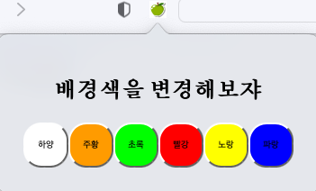 우선 요렇게 해당 익스텐션 프로그램 아이콘을 누르면 popup을 구현한것처럼 타이틀과 색상 버튼이 나타납니다.