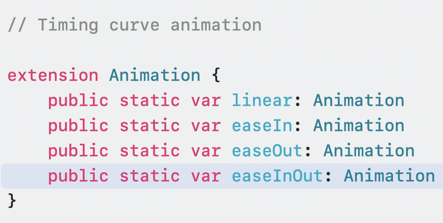 물론 위와 같이 직접 만들어도 되지만 타이밍 커브 애니메이션을 위해 SwiftUI에서는 linear부터 easeInOut까지 3가지의 내장된 애니메이션 설정을 제공합니다.