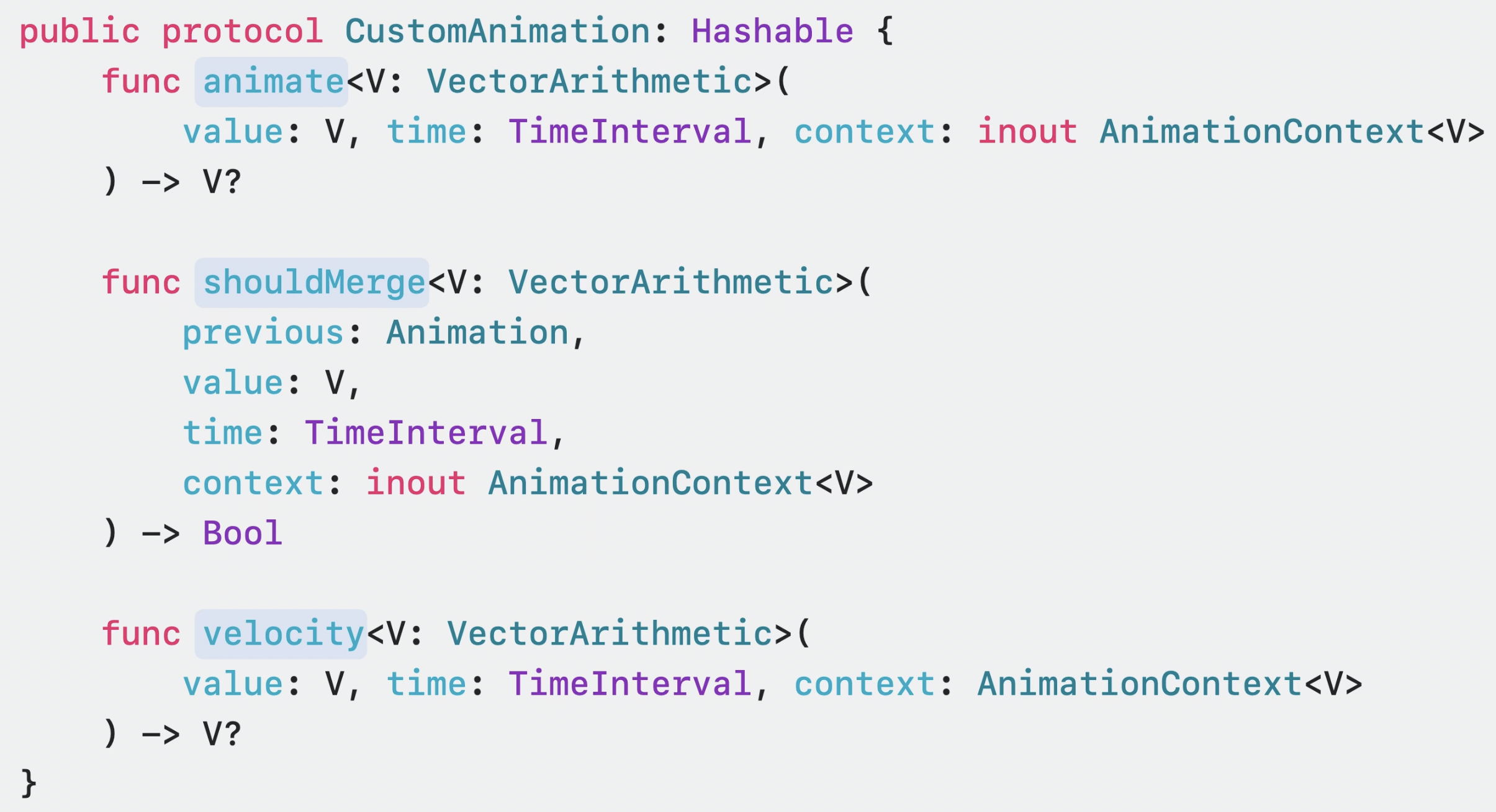 public protocol CustomAnimation : Hashable { func animate<V>(value: V, time: TimeInterval, context: inout AnimationContext<V>) -> V? where V : VectorArithmetic ... }1️⃣ value: 애니메이션을 적용할 벡터값, V는 VectorArithmetic 프로토콜을 따르는 타입니다.