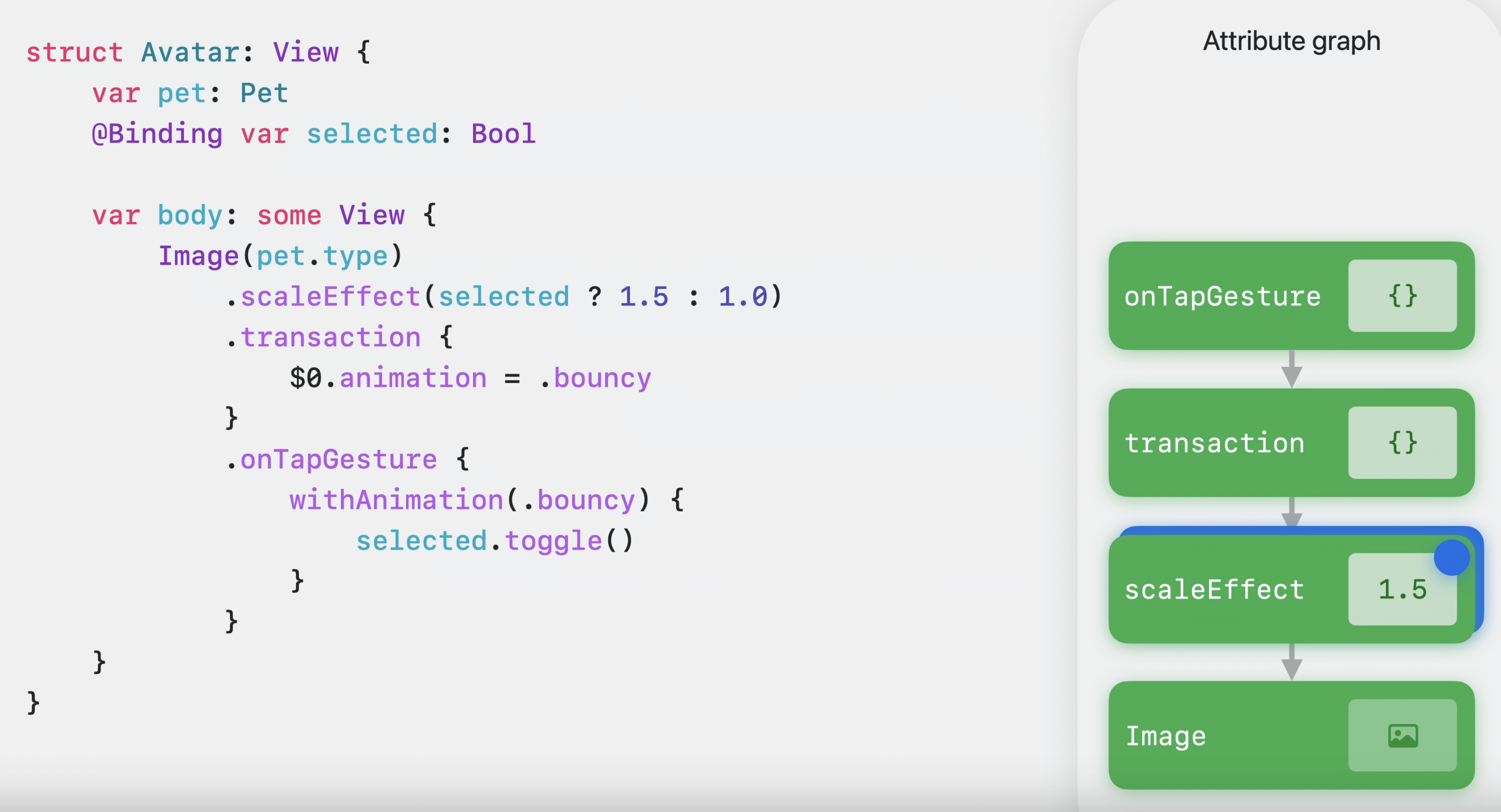 struct ContentView: View { @State private var selected: Bool = false var body: some View { Image(systemName: "pencil") .resizable() .frame(width: 100, height: 100) .animation(.smooth) { $0.shadow(radius: selected ? 12 : 8) } .animation(.smooth) { $0.scaleEffect(selected ? 1.5 : 1.0) } .onTapGesture { selected.toggle() } } }방지하기 위해 이렇게 새로운 버전의 애니메이션 모디파이어가 나왔습니다.