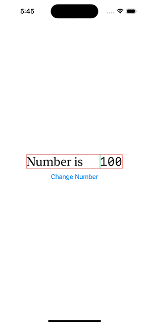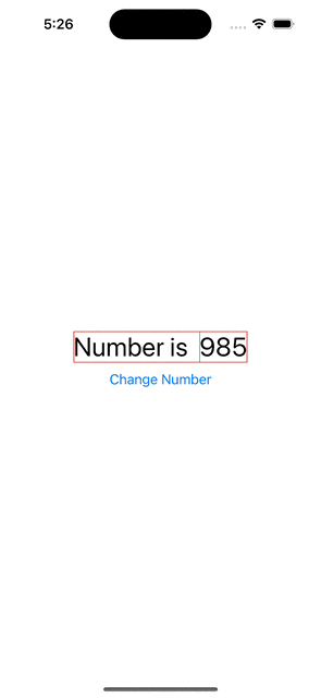 private struct MonospacedDigitView: View { @State var num: Int = 100 var body: some View { VStack(spacing: 10) { HStack { Text("Number is") .font(.system(size: 32)) Spacer() Text("\(num)") .font(.system(size: 32)) .border(.green) } .border(.red) .padding(.horizontal, 70) 🙋🏻🙋🏻🙋🏻🙋🏻🙋🏻🙋🏻🙋🏻🙋🏻 .monospacedDigit() Button( action: { num = .random(in: 100...999) }, label: { Text("Change Number") } ) } } }간단하죠?