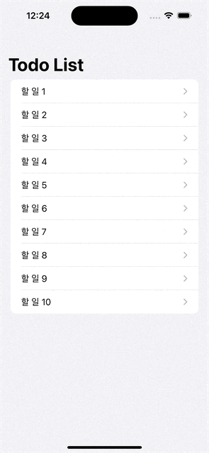 import SwiftUI struct TodoListView: View { @ObservedObject var presenter: TodoListPresenter var body: some View { NavigationView { List(presenter.todos) { todo in NavigationLink( destination: TodoDetailView(todo: todo), isActive: Binding( get: { presenter.router.selectedTodo?.id == todo.id }, set: { isActive in if isActive { presenter.didSelectedTodo(todo) } else { presenter.didFinishDisplayTodoDetail() } } ), label: { Text(todo.title) } ) } .navigationTitle("Todo List") } } }가장 메인 진입점으로 TodoListView를 구성합니다.