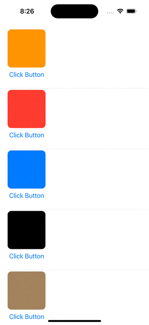 struct ContentView: View { @State var title: String = "" var colors: [Color] = [.orange, .red, .blue, .black, .brown] var body: some View { VStack { Text(title) .font(.title) .bold() List { ForEach(colors, id: \.self) { color in CellView(title: $title, color: color) .onTapGesture { title = "\(color.description) Cell Tapped" } } } .listStyle(.plain) } } } private struct CellView: View { @Binding var title: String var color: Color var body: some View { VStack { RoundedRectangle(cornerRadius: 10) .fill(color) .frame(width: 100, height: 100) Button( action: { title = "\(color.description) Button Clicked" }, label: { Text("Click Button") } ) Spacer() } } }간단히 설명해보자면 List를 활용하여 CellView를 만들어서 목록으로 보여주는 뷰입니다.