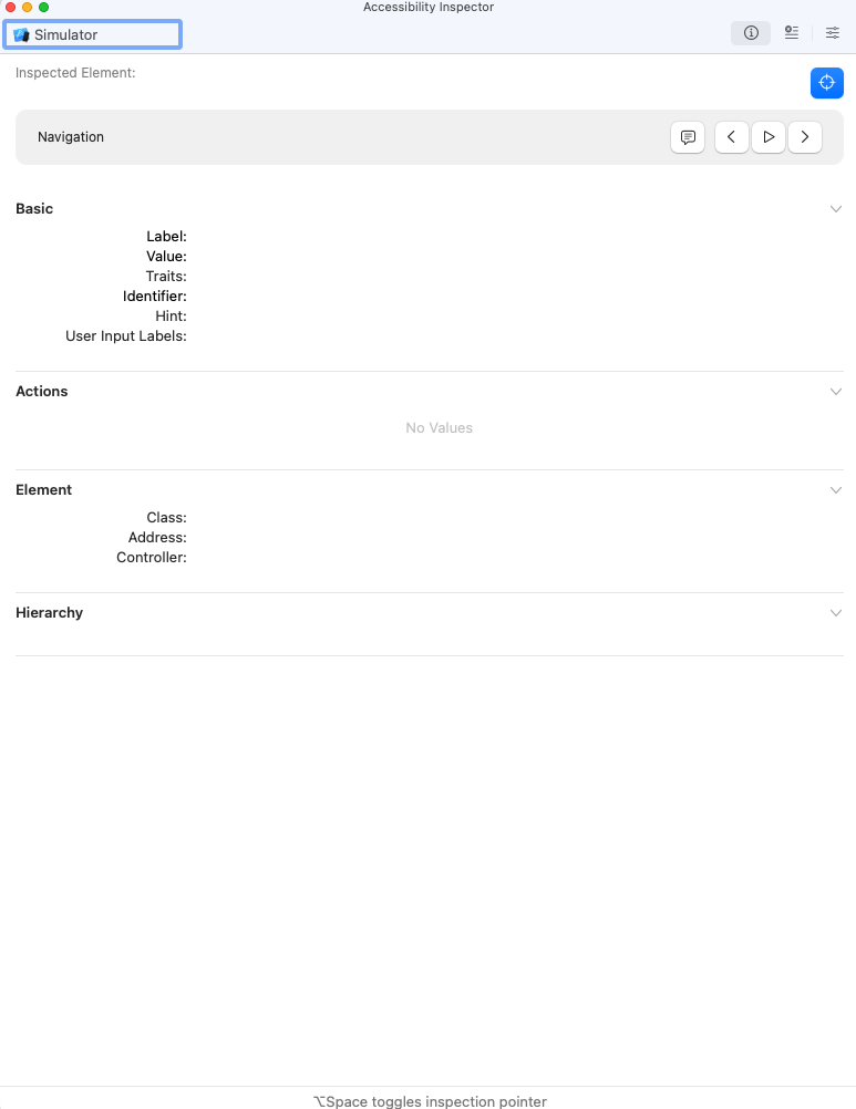 3️⃣ Accessibility Inspector에서 이제 시뮬레이터에 설정된 접근성 정보 확인