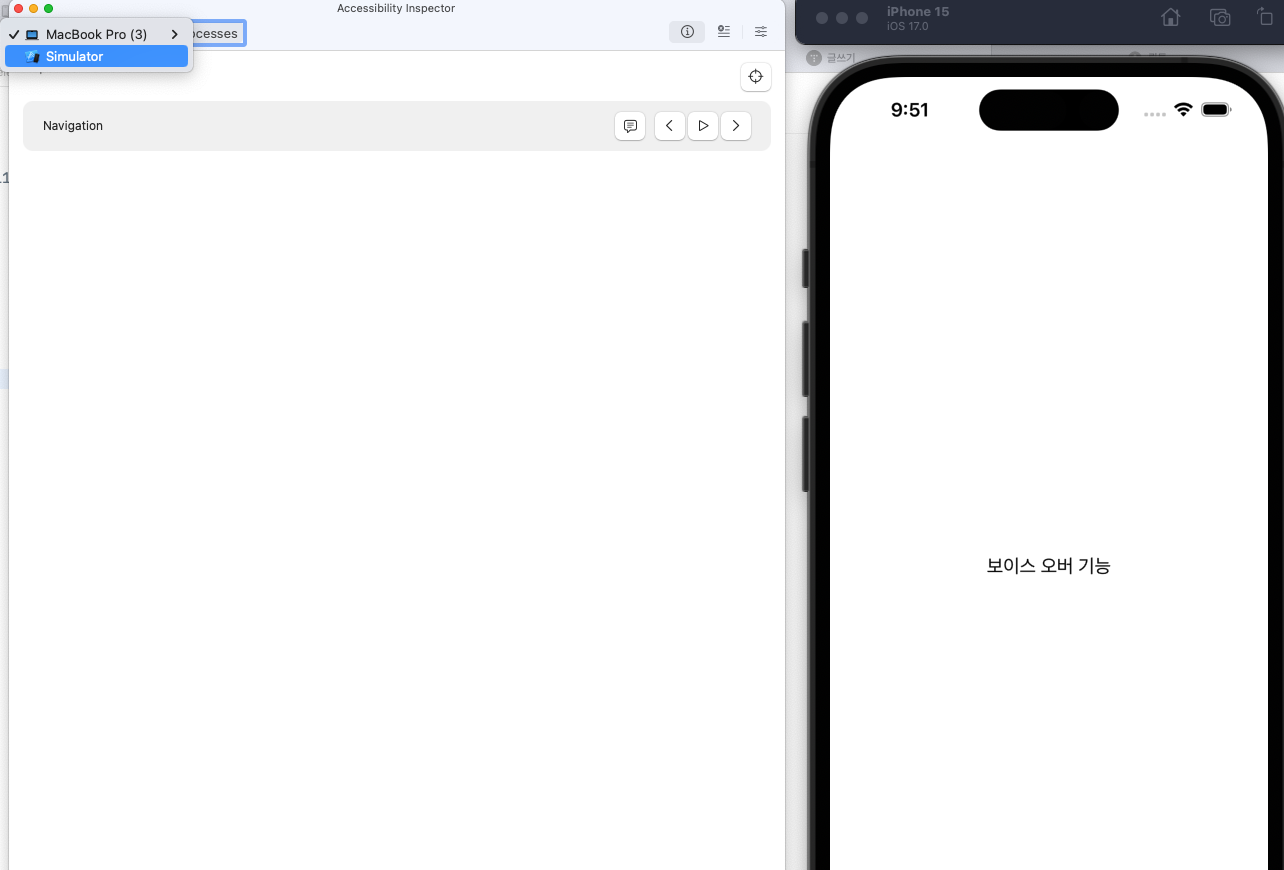 그냥 시뮬레이터에서 설정 > VoiceOver를 키면 동작이 안되고 Accessibility Inspector를 이용해야 해요!