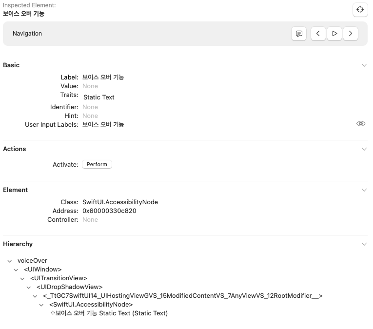 이런식으로 해당 UI 요소가 갖는 보이스오버의 Label을 확인할 수 있습니다.