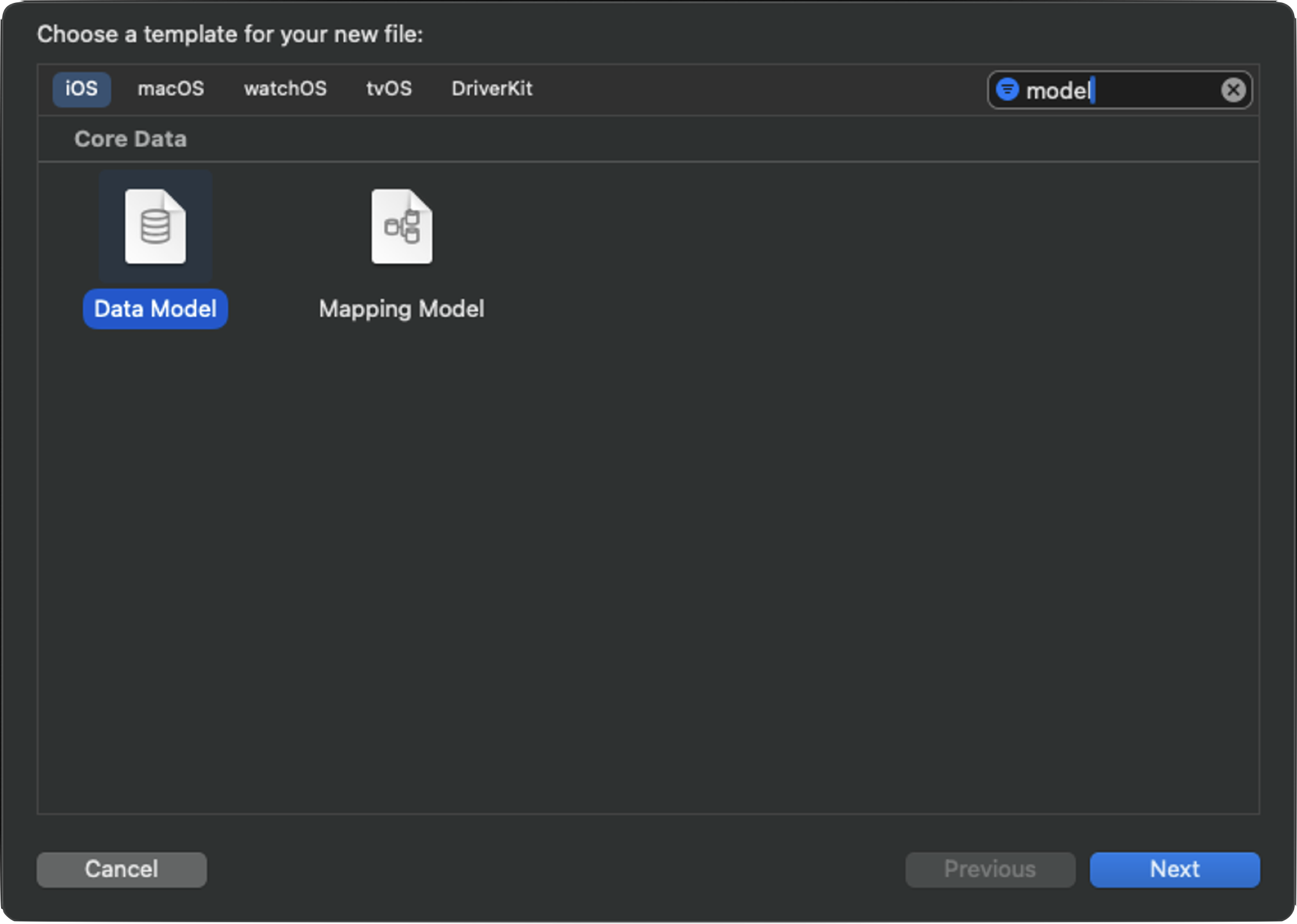 여기서 코어 데이터 섹션의 데이터 모델을 선택하여 만들어줍니다.