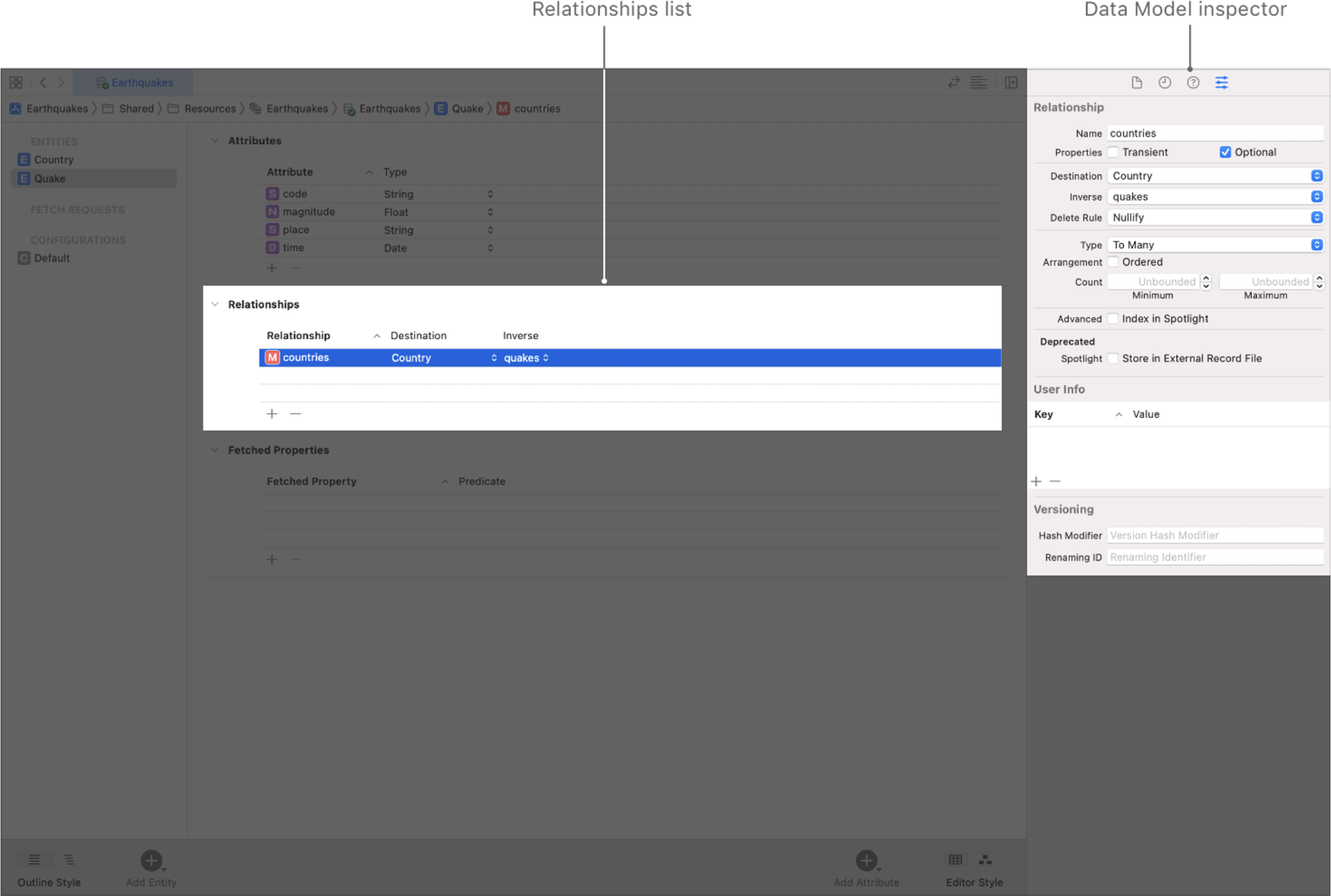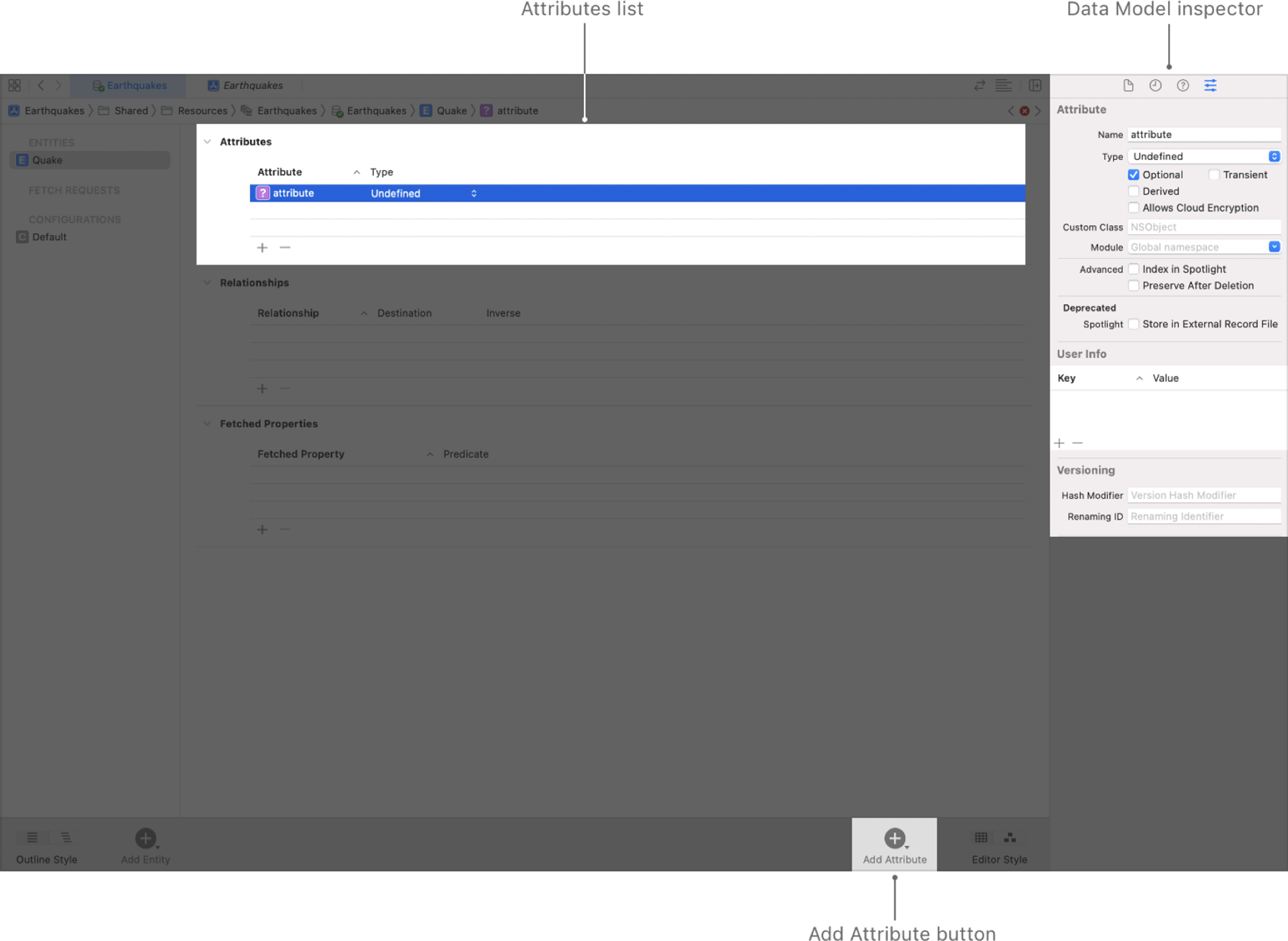 이 속성들은 Data Model inspector에서 다뤄줄 수 있습니다.
