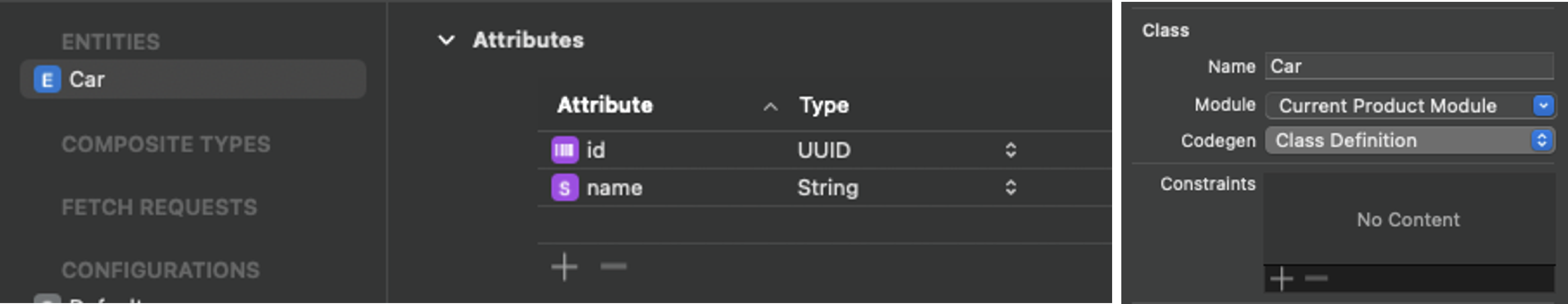 func createData() { guard let context = self.persistentContainer?.viewContext else { return } let newCar = Car(context: context) newCar.id = UUID() newCar.name = "benz" try? context.save() }persistentContainer의 viewContext를 가져와 새로 만들 Car 인스턴스 생성을 위한 Car 타입을 생성 시 해당 context를 넣어줍니다.