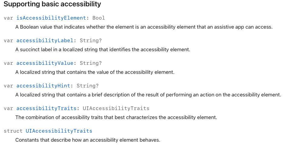 결국 우리가 지금까지 쓰던 accessibilityLabel, accessibilityHint 등과 같은 접근성 관련 작업들이 모두 이 UIAccessibility에 소개되고 포함되어 있는것이죠!