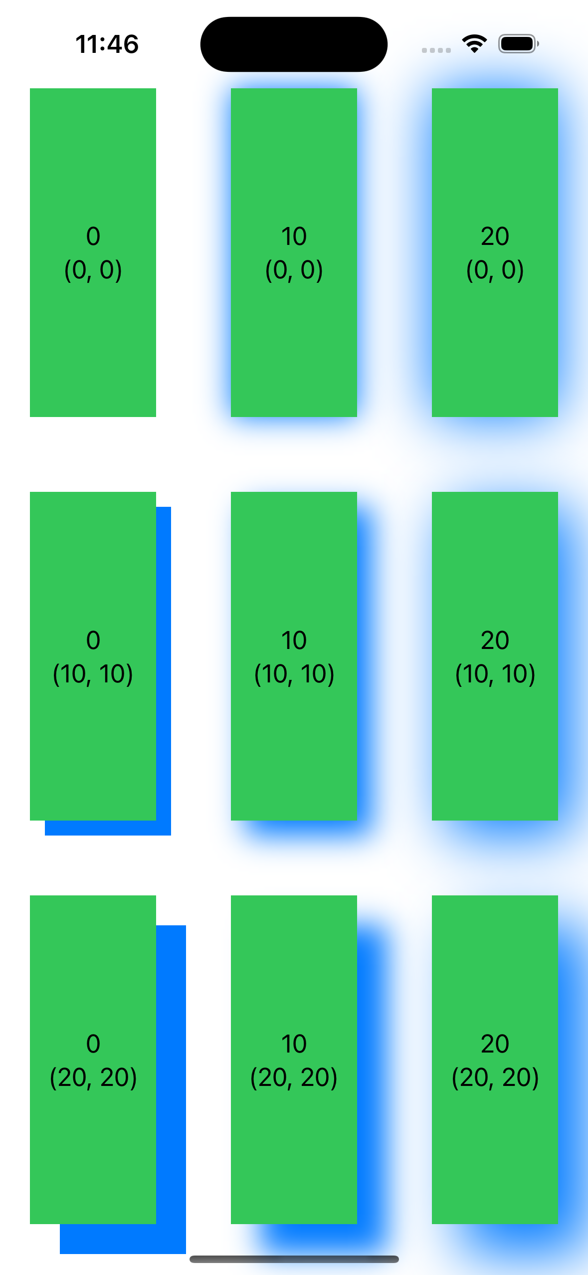 import SwiftUI struct ContentView: View { let steps = [0, 10, 20] var body: some View { VStack(spacing: 50) { ForEach(steps, id: \.self) { offset in HStack(spacing: 50) { ForEach(steps, id: \.self) { radius in Color.green .shadow( color: .blue, radius: CGFloat(radius), x: CGFloat(offset), y: CGFloat(offset)) .overlay { VStack { Text("\(radius)") Text("(\(offset), \(offset))") } } } } } } .padding(.horizontal, 20) } }해당 코드를 예시로 보겠습니다.