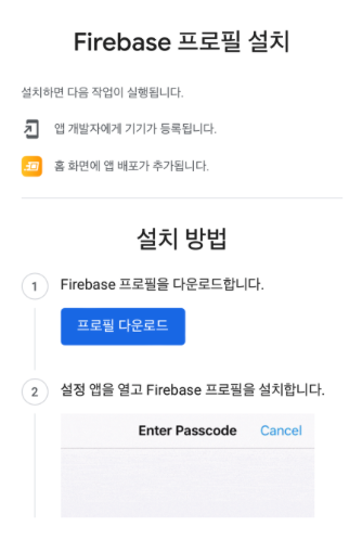 친절하게 스텝별로 알려주기에 프로필 다운로드를하고 설정 앱에서 파이어베이스 프로필을 설치합니다.