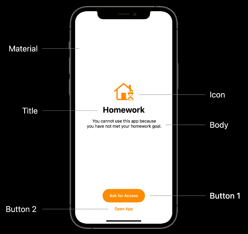 import ManagedSettings import ManagedSettingsUI class MyShieldConfiguration: ShieldConfigurationProvider { override func configuration(for application: Application) -> ShieldConfigutaion { return ShieldConfiguration( backgroundEffect: ... backgroundColor: ... icon: ... title: ShieldConfiguration.Label( text: ... color: ... ), subtitle: ShieldConfiguration.Label( text: ... color: ... ) ) } }ShieldConfigurationProvider를 상속받아 이용하는것이죠.