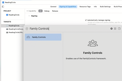 Xcode에서 해당 앱 타겟을 선택하고 Signing & Capabilities 탭에서 Family Controls를 추가합니다.
