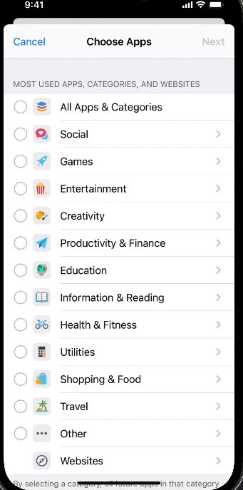 import FamilyControls import SwiftUI @StateObject var model = MyModel() @State var isPresented = false var body: some View { Button("Select Apps to Discourage") { isPresented = true } .familyActivityPicker(isPresented: $isPresented, selection: $model.selectionTpDiscourage) }즉 이러한 시트를 노출해주는데요.