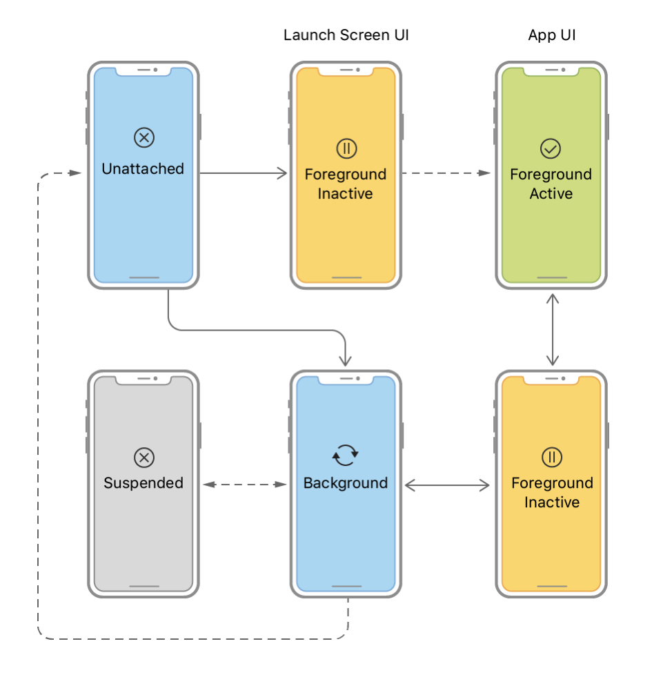 : iOS에서의 앱 생명주기는 아래와 같은 순서로 볼 수 있습니다.